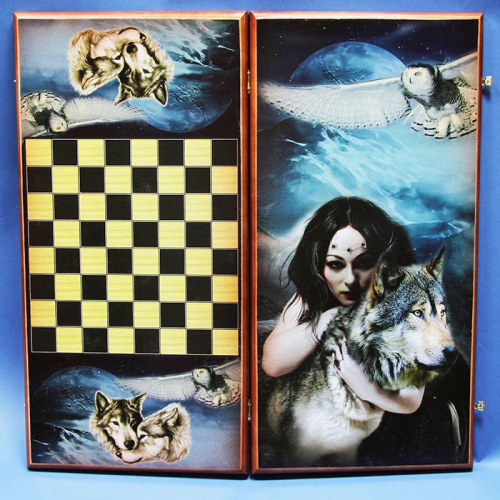 FV-90110 Нарды средние "Девушка с волком" 50х25х4см, картина под лаком, 2 замка, дерево