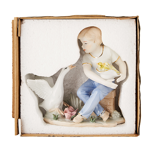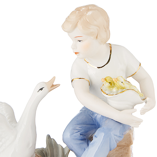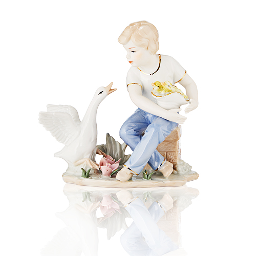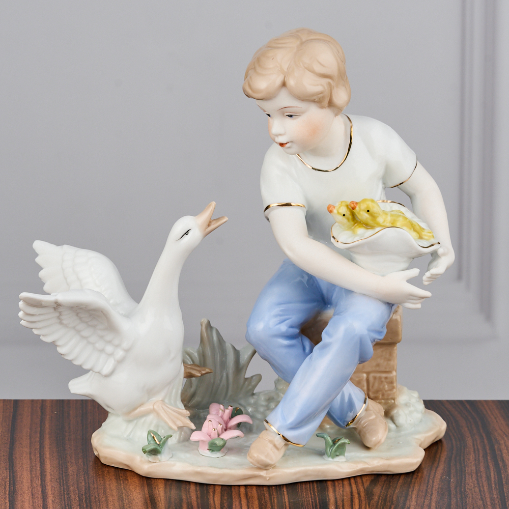 Фарфоровая статуэтка Мальчик с уткой и утятами может стать памятным подарком к празднику, к юбилею, свадьбе или новоселью. Оригинальный дизайн фигурки Мальчик из фарфора позволяет разместить ее практически в любой комнате Вашего дома. Стильная фарфоровая статуэтка Мальчик придаст интерьеру благородства и изысканности. Фигурка изготовлена из высококачественного фарфора с использованием техники бисквит. Размер Мальчика 17,5х9х17,5 см. Фарфор универсален, так как хорошо впишется как в квартиру, так и в кабинет директора, интерьер столовой, гостинной, детской или спальни. Фигурка фарфоровая Мальчик поможет пополнить коллекцию очаровательных, оригинальных фарфоровых статуэток в вашем доме. Выбирайте и другие товары нашего ассортимента, нажав на значок Стиль-Ампир справа от фотографии товара.
