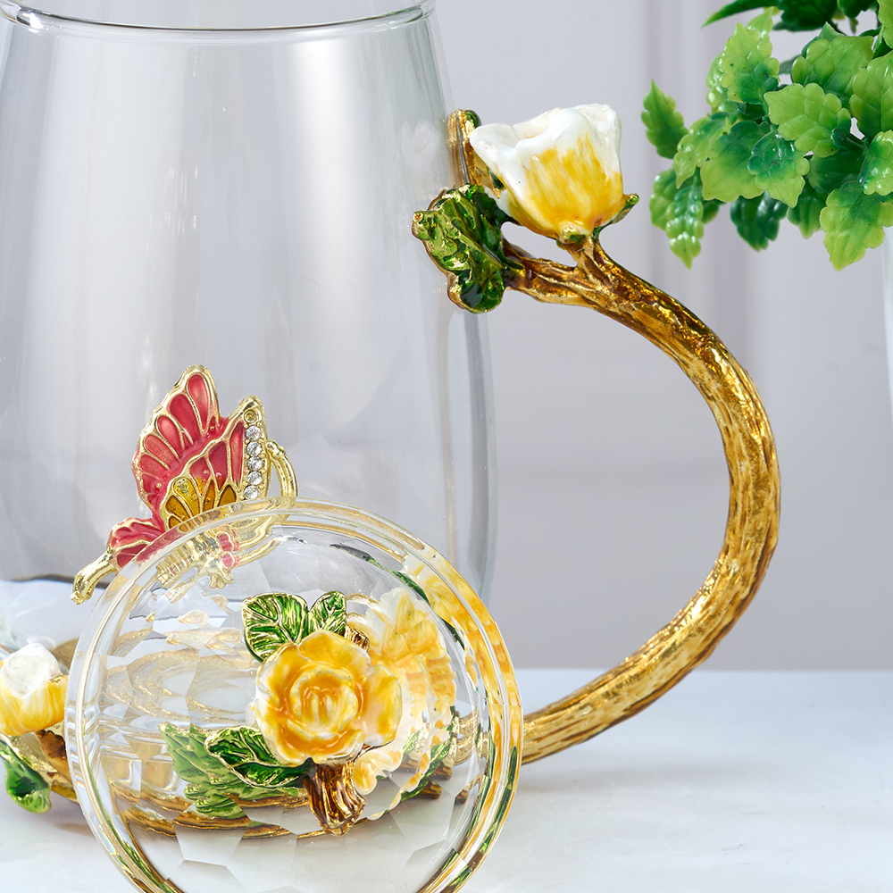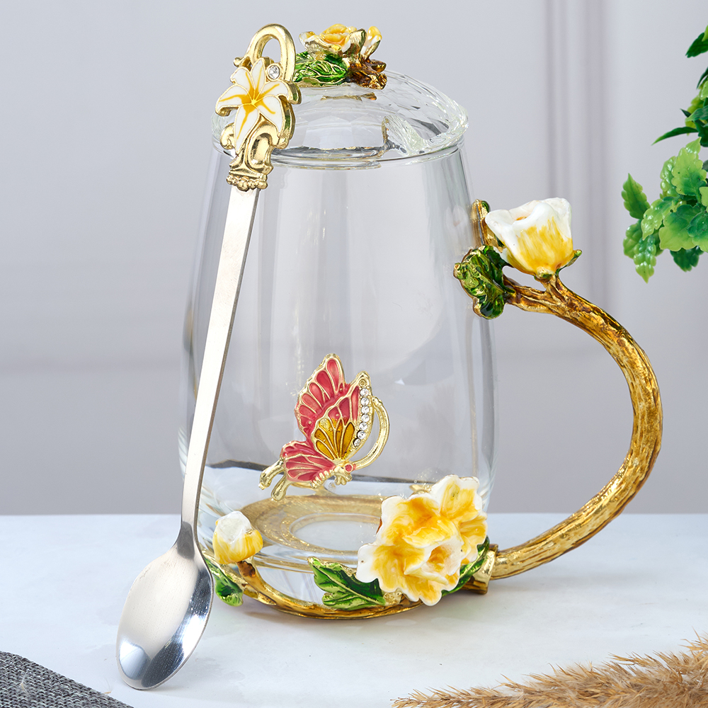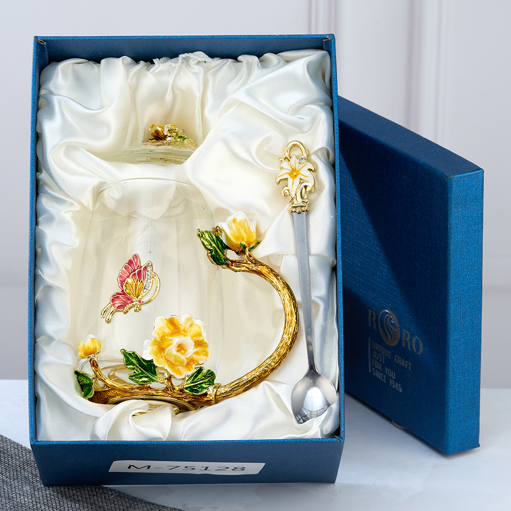 Стеклянный чайно-кофейный набор в подарочной коробке. Чайная чашка Бабочка с крышкой и ложечкой в романтическом стиле. Кофейная кружка с ложкой в оригинальном исполнении. Стеклянная кофейная кружка, большого объёма, из стекла, подойдет для горячих и холодных напитков. Чайная чашка с крышечкой выдерживает температуру до 150 градусов С. Кружка, ручной работы, с отделкой эмалью и стразами, лучший подарок на день рождения для женщины, любимой, маме, сестре, подруге, бабушке, дочери, любителю чая и кофе, на любой другой праздник и торжество, будь то день рождение, новоселье, 8 марта, Новый год. Чашка из стекла ручной работы выполнена в элегантном стиле с 3D-дизайном в виде Бабочки. Элегантный дизайн, вместе с современными технологиями, предлагает необычные кофейные чашки, которые являются не только посудой для напитков, но и произведением искусства и коллекцией для вашего дома. Подарочный набор кружка для кофе и чая с крышечкой, объемом 400 мл размер кружки 11,5х7,5х16 см, вес 435 гр. и ложечки 16 см, упакован в подарочную коробку с атласным ложементом. Ложечка в наборе также отделана эмалью в стиль всего набора. Кофейная чашка изготовлена из высококачественного экологически чистого прочного стеклянного материала, не содержащего свинца, является лучшим выбором по сравнению с пластиком или акриловым материалом. Подарочную кружку легко мыть. Для более длительного срока службы, рекомендуем мыть сервиз вручную. Чайную чашку из стекла можно использовать для утреннего кофе и чая, горячих напитков, горячего шоколада, молока, какао, сока или других любимых напитков. Внешний вид делает этот подарочный набор привлекательным для дома, ресторана и офиса. Красивая чайная и кофейная посуда для дома, необычной формы и дизайна не оставит равнодушными Ваших гостей. Кофейные, чайные сервизы в красивой подарочной упаковке, идеальный подарок. Ложечка вложена сбоку от ложемента чашки. Выбирайте и другие товары нашего ассортимента, нажав на значок Стиль-Ампир справа от фотографии товара.