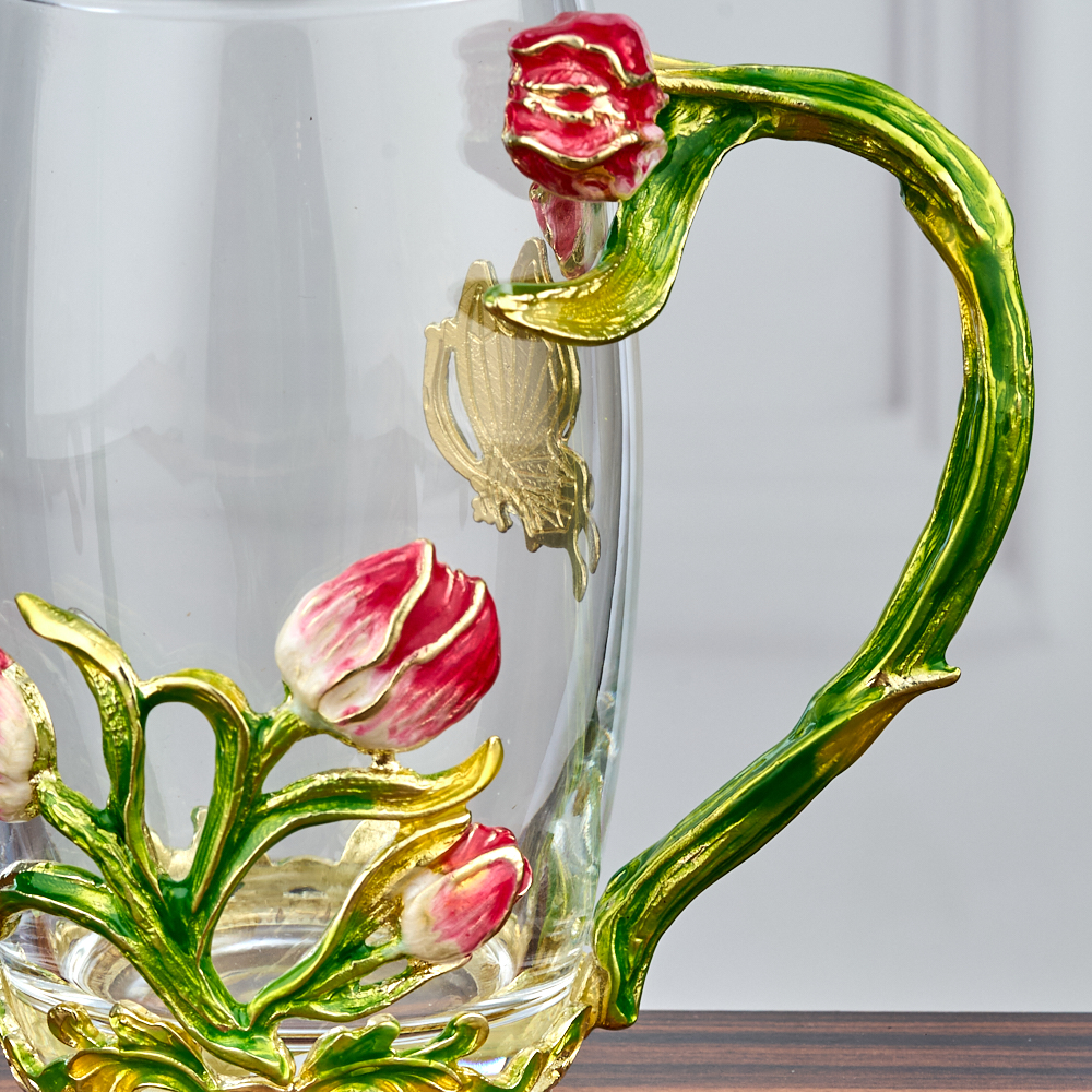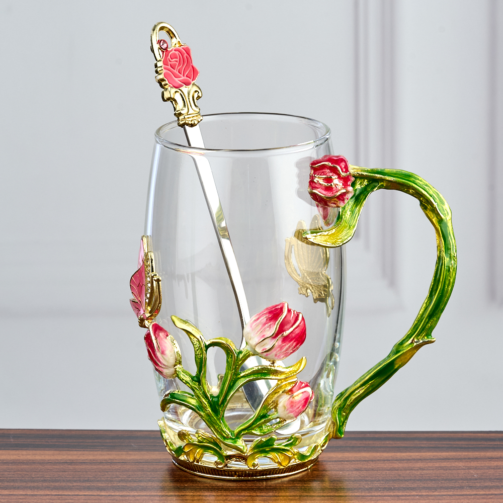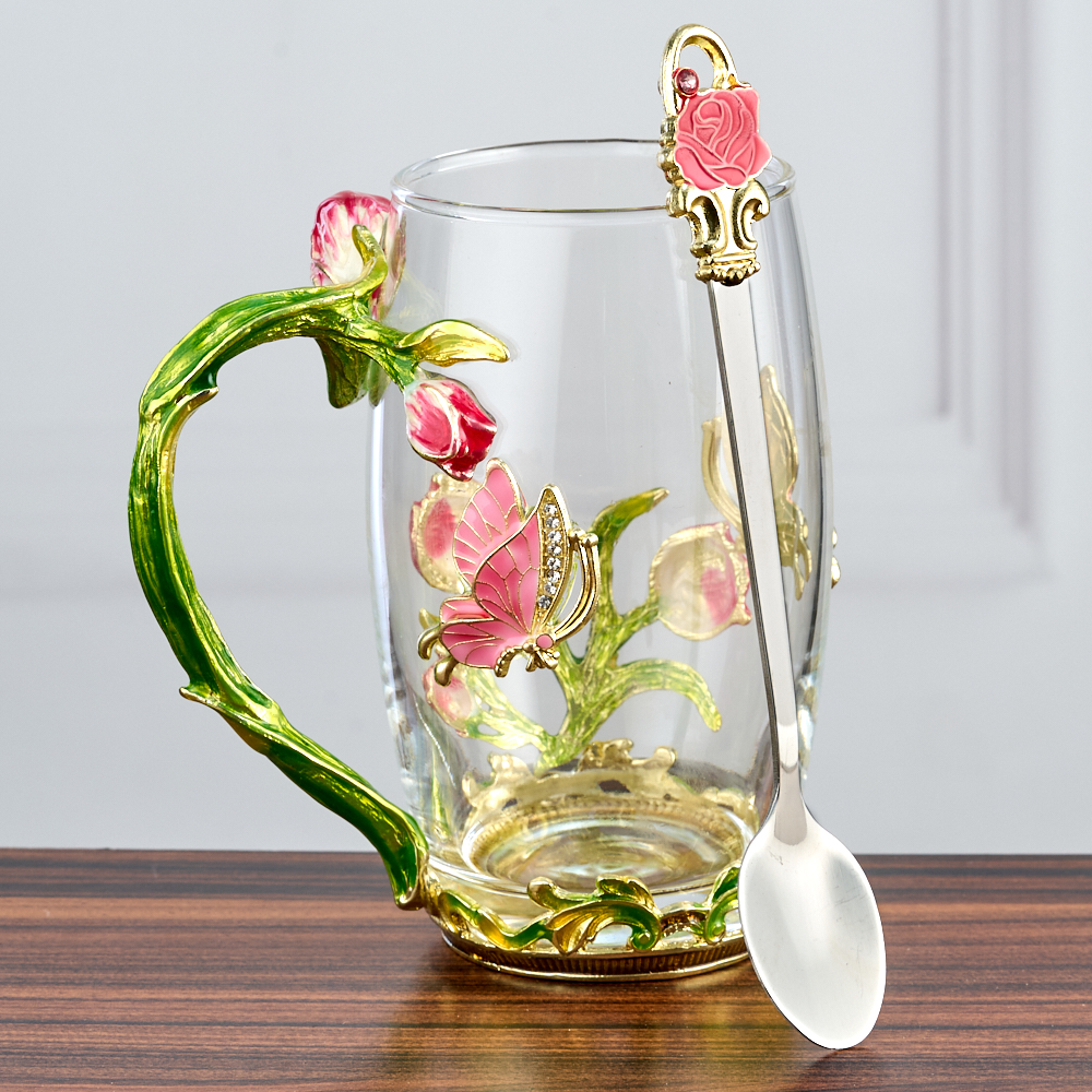 Кружка стеклянная с ложкой "Бабочки и Тюльпаны".