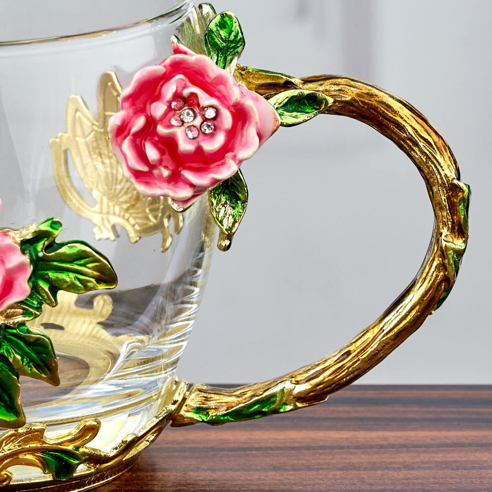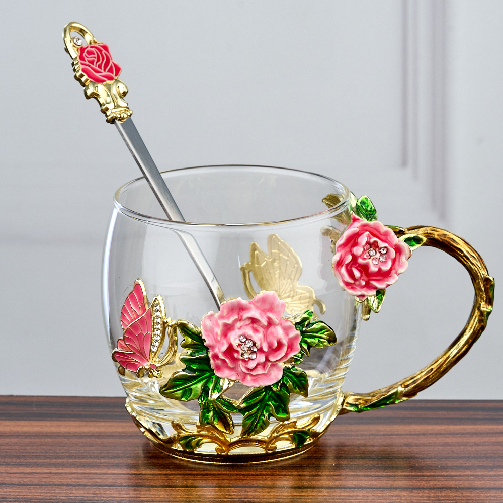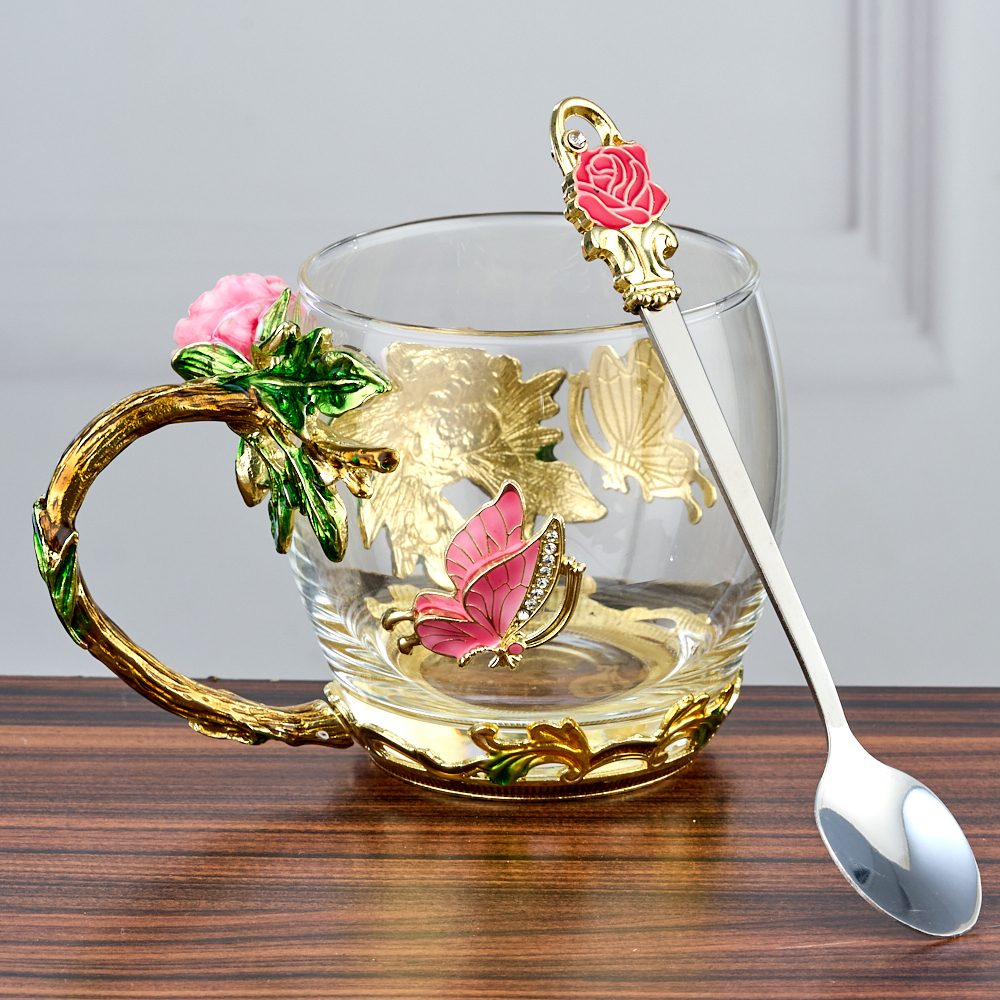 Кружка стеклянная с ложкой "Бабочки и Розы".
