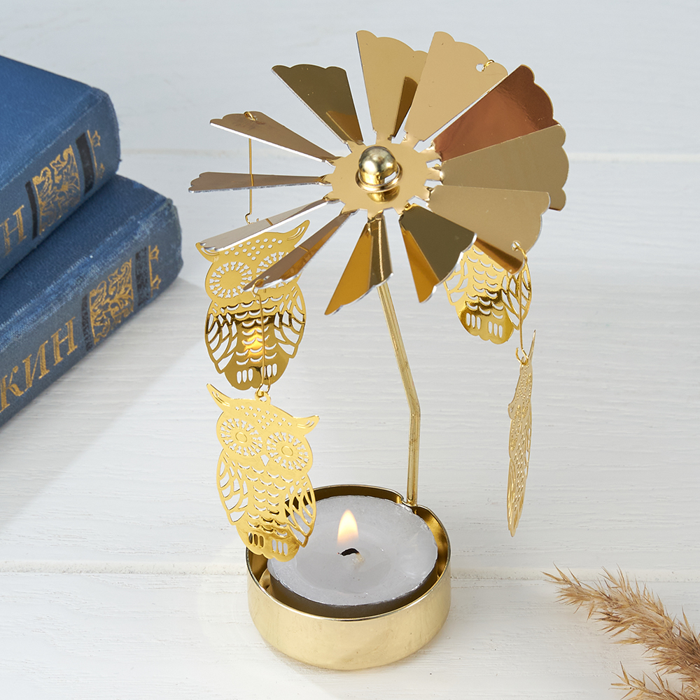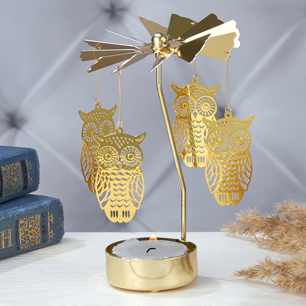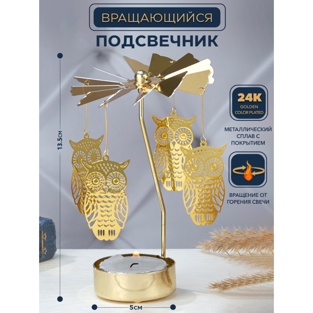 Подсвечник карусель вращающийся Совы с восковой свечой в подставке с подарочной упаковкой станет удивительным подарком к празднику. Четыре вращающиеся фигурки подсвечника Совы создают в доме уютную сказочную атмосферу, они имеют размер 2,5х4,5 см. Приглушите свет, зажгите свечу и от тепла закружится волшебная карусель. Декоративные металлические элементы подсвечника отражают свет и появляются красивые блики, при тепловом воздействии свечи на вращающуюся часть подсвечника. Подсвечник-карусель принесет дух волшебного Нового года и Рождества. Также подсвечник - это идеальное украшение стола для романтического ужина при свечах. Свечу можно зажигать в будние дни, чтобы в доме стало тепло и уютно. Металлический подсвечник не ржавеет и имеет неограниченный срок службы, его можно использовать как украшение вашей беседки или терассы на даче или в загородном доме. В набор входят подсвечник с декоративными элементами, инструкция по сборке и восковая свеча. Стильный подсвечник - это прекрасный подарок для себя, любимому, любимой, для друзей, подруге, коллеге, учителю, детям, мальчику, девочке, маме, бабушке, на любой праздник. Никто не останется равнодушным к такому удивительному подарку. Подсвечник изготовлен из металла с покрытием 24k Gold Color Plated, имеет высоту 13,5 см, диаметр вращающегося элемента 7 см, диаметр основания подсвечника 5 см, длина петельки подвеса 3 см. Чайная свеча входит в комплект подсвечника. Перед применением снимите белую защитную пленку с вращательного элемента подсвечника. Выбирайте и другие товары нашего ассортимента, нажав на значок Стиль-Ампир справа от фотографии товара.