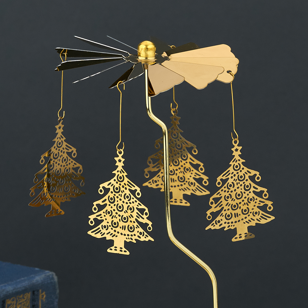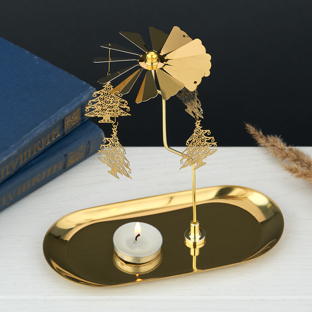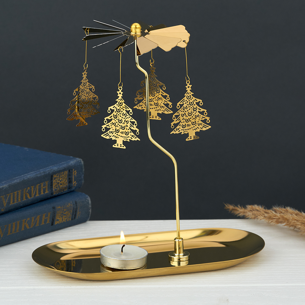 Подсвечник карусель вращающийся Елочки с восковой свечой на подставке с подарочной упаковкой станет удивительным подарком к празднику. Четыре вращающиеся фигурки подсвечника Елочки создают в доме уютную сказочную атмосферу, они имеют размер 3,5х4,5 см. Приглушите свет, зажгите свечу и от тепла закружится волшебная карусель. Декоративные металлические элементы подсвечника отражают свет и появляются красивые блики, при тепловом воздействии свечи на вращающуюся часть подсвечника. Подсвечник-карусель принесет дух волшебного Нового года и Рождества. Также подсвечник - это идеальное украшение стола для романтического ужина при свечах. Свечу можно зажигать в будние дни, чтобы в доме стало тепло и уютно. Металлический подсвечник не ржавеет и имеет неограниченный срок службы, его можно использовать как украшение вашей беседки или терассы на даче или в загородном доме. В набор входят подсвечник с декоративными элементами, подставка тарелочка металлическая, инструкция по сборке и восковая свеча. Стильный подсвечник - это прекрасный подарок для себя, любимому, любимой, для друзей, подруге, коллеге, учителю, детям, мальчику, девочке, маме, бабушке, на любой праздник. Никто не останется равнодушным к такому удивительному подарку. Подсвечник изготовлен из металла с покрытием 24k Gold Color Plated, имеет высоту 19 см, диаметр вращающегося элемента 8 см, размер тарелочки-подставки 17х8,5 х1 см, длина петельки подвеса 3 см. Чайная свеча входит в комплект подсвечника. Подставка карусели крепится к подставке при помощи магнита. Перед применением снимите белую защитную пленку с вращательного элемента подсвечника. Выбирайте и другие товары нашего ассортимента, нажав на значок Стиль-Ампир справа от фотографии товара.