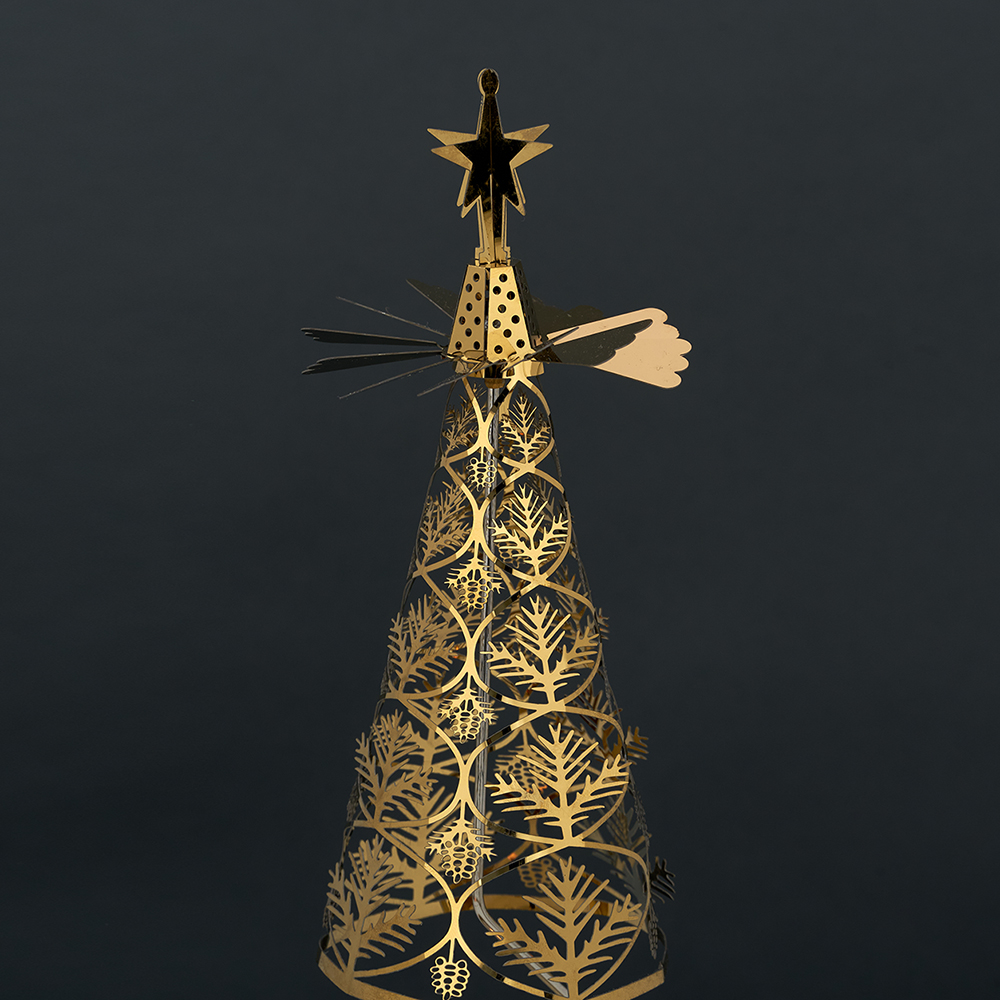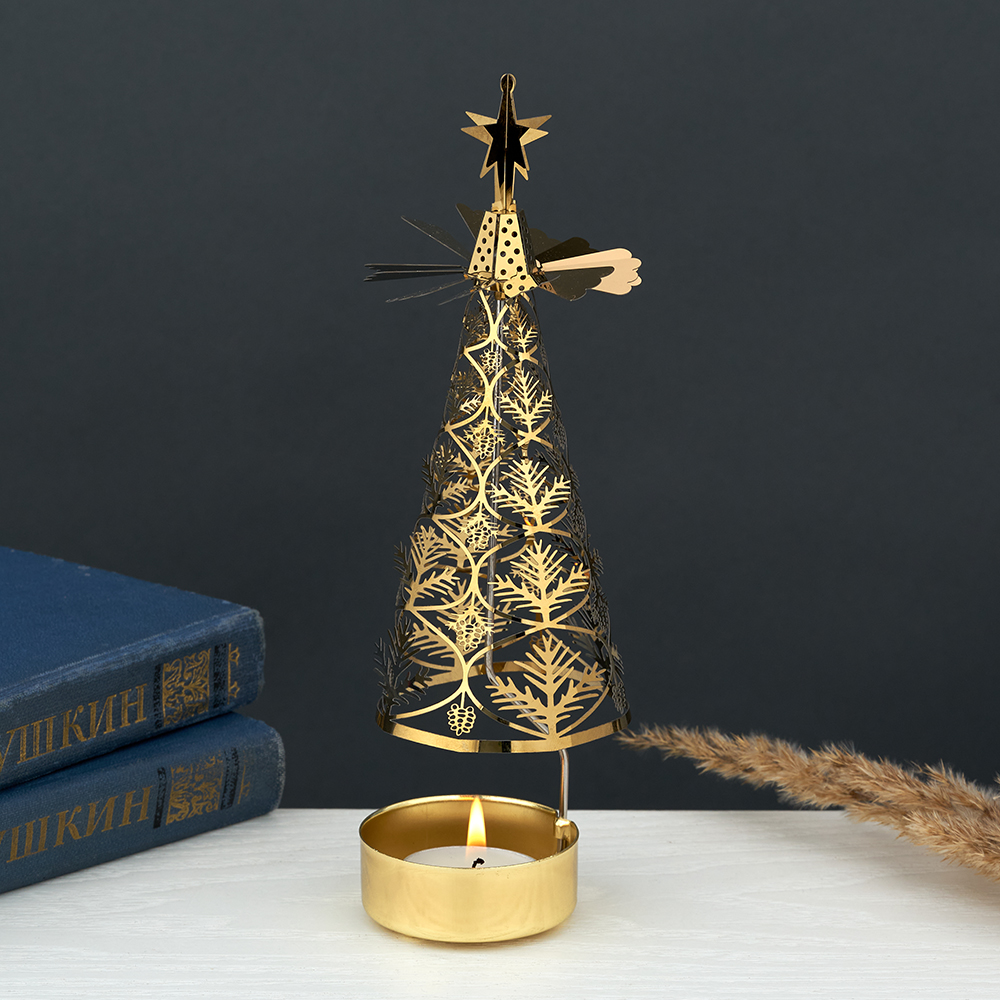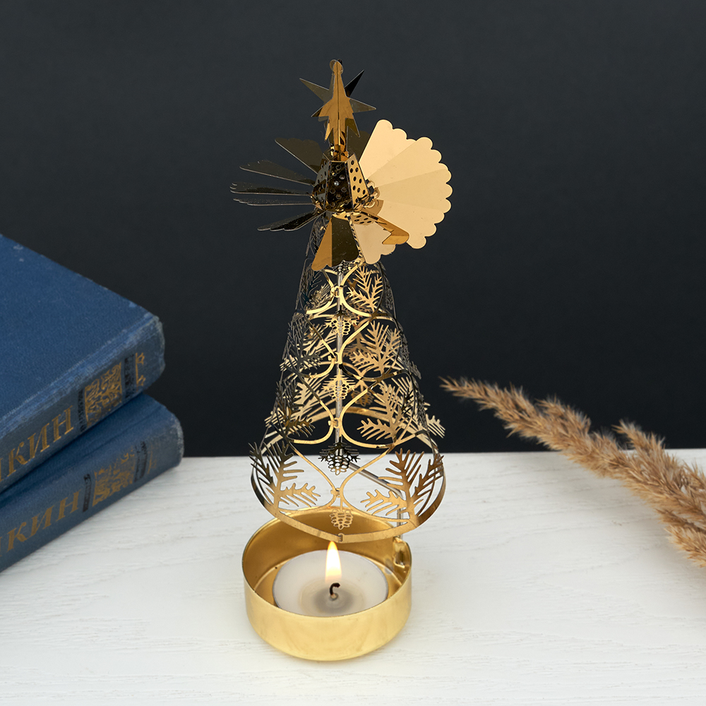 Подсвечник с каруселью вращающийся Елочка с восковой свечой в подставке с подарочной упаковкой станет удивительным подарком к празднику. Оригинальная форма подсвечника в виде Елочки с фигурными прорезями и ажурным декором в виде хвои поможет создать праздничную автмосферу в вашем доме. Приглушите свет, зажгите свечу и от тепла закружится волшебная карусель. Декоративные металлические элементы подсвечника отражают свет и появляются красивые блики, при тепловом воздействии свечи на вращающуюся часть подсвечника. Подсвечник-карусель принесет дух волшебного Нового года и Рождества. Также подсвечник - это идеальное украшение стола для романтического ужина при свечах. Свечу можно зажигать в будние дни, чтобы в доме стало тепло и уютно. Металлический подсвечник не ржавеет и имеет неограниченный срок службы, его можно использовать как украшение вашей беседки или терассы на даче или в загородном доме. В набор входят подсвечник с декоративными элементами, инструкция по сборке и восковая свеча. Стильный подсвечник - это прекрасный подарок для себя, любимому, любимой, для друзей, подруге, коллеге, учителю, детям, мальчику, девочке, маме, бабушке, на любой праздник. Никто не останется равнодушным к такому удивительному подарку. Подсвечник изготовлен из металла с покрытием 24k Gold Color Plated, имеет высоту 20,5 см, диаметр вращающегося элемента 6,5 см, диаметр основания подсвечника 5,2 см. Чайная свеча входит в комплект подсвечника. Перед применением снимите белую защитную пленку с вращательного элемента подсвечника. Выбирайте и другие товары нашего ассортимента, нажав на значок Стиль-Ампир справа от фотографии товара.