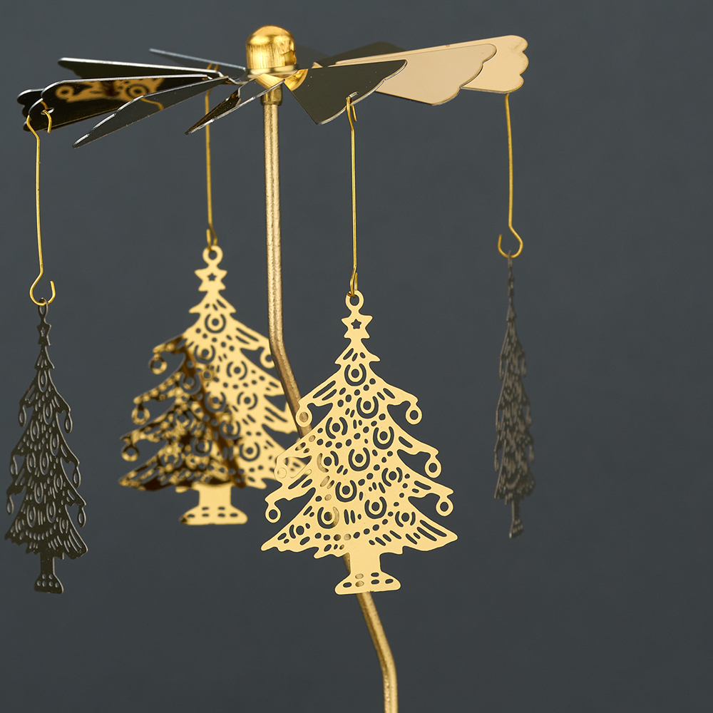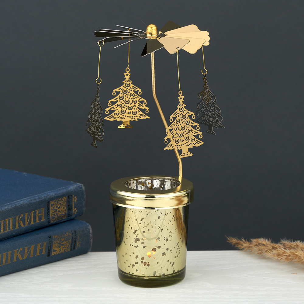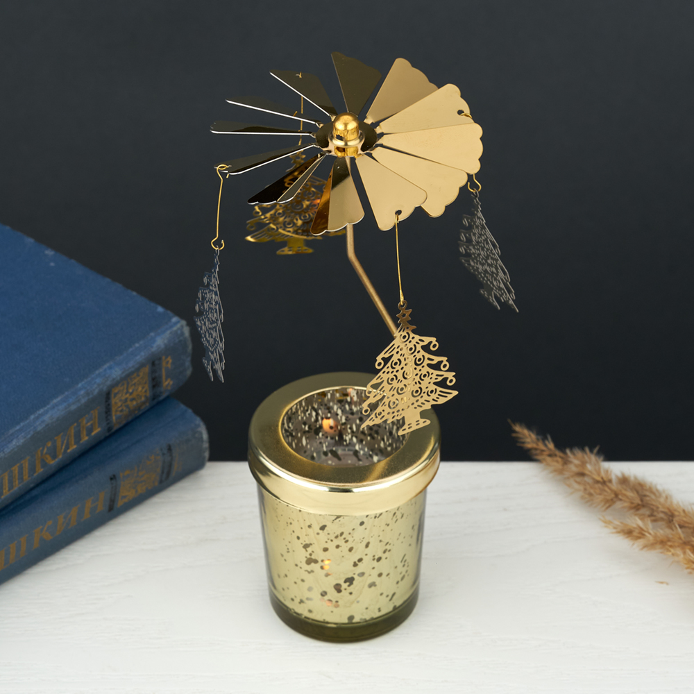 Подсвечник карусель вращающийся Елочки с восковой свечой на подставке с подарочной упаковкой станет удивительным подарком к празднику. Четыре вращающиеся фигурки подсвечника Елочки создают в доме уютную сказочную атмосферу, они имеют размер 3,5х4,5 см. Приглушите свет, зажгите свечу и от тепла закружится волшебная карусель. Декоративные металлические элементы подсвечника отражают свет и появляются красивые блики, при тепловом воздействии свечи на вращающуюся часть подсвечника. Подсвечник-карусель принесет дух волшебного Нового года и Рождества. Также подсвечник - это идеальное украшение стола для романтического ужина при свечах. Свечу можно зажигать в будние дни, чтобы в доме стало тепло и уютно. Металлический подсвечник не ржавеет и имеет неограниченный срок службы, его можно использовать как украшение вашей беседки или терассы на даче или в загородном доме. В набор входят подсвечник с декоративными элементами, подставка стаканчик с золотистым покрытием, инструкция по сборке и восковая свеча. Стильный подсвечник - это прекрасный подарок для себя, любимому, любимой, для друзей, подруге, коллеге, учителю, детям, мальчику, девочке, маме, бабушке, на любой праздник. Никто не останется равнодушным к такому удивительному подарку. Подсвечник изготовлен из металла с покрытием 24k Gold Color Plated, имеет высоту 18 см, диаметр вращающегося элемента 8 см, размер стаканчика-подставки 5,8х5,8 х7 см, диаметр дна 4,5 см, длина петельки подвеса 3 см. Чайная свеча входит в комплект подсвечника. Подставка карусели крепится к подставке при помощи магнита. Перед применением снимите белую защитную пленку с вращательного элемента подсвечника. Выбирайте и другие товары нашего ассортимента, нажав на значок Стиль-Ампир справа от фотографии товара.