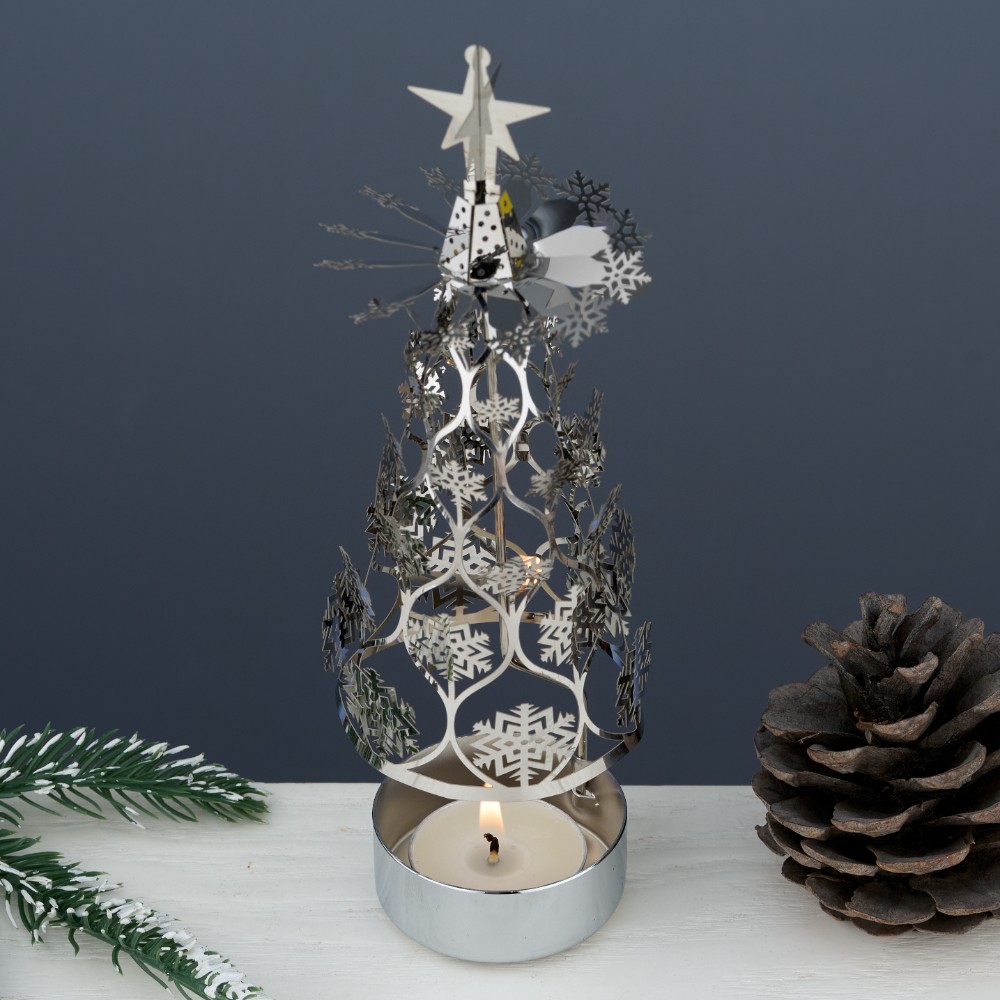 Подсвечник вращающийся Елочка с восковой свечой в подставке с подарочной упаковкой станет удивительным подарком к празднику. Оригинальная форма подсвечника в виде Елочки с фигурными прорезями и ажурным декором в виде снежинок поможет создать праздничную атмосферу в вашем доме. Приглушите свет, зажгите свечу и от тепла закружится волшебная карусель. Декоративные металлические элементы подсвечника отражают свет и появляются красивые блики, при тепловом воздействии свечи на вращающуюся часть подсвечника. Подсвечник-карусель принесет дух волшебного Нового года и Рождества. Также подсвечник - это идеальное украшение стола для романтического ужина при свечах. Свечу можно зажигать в будние дни, чтобы в доме стало тепло и уютно. Металлический подсвечник не ржавеет и имеет неограниченный срок службы, его можно использовать как украшение вашей беседки или терасcы на даче или в загородном доме. В набор входят подсвечник с декоративными элементами, инструкция по сборке и восковая свеча. Стильный подсвечник - это прекрасный подарок для себя, любимому, любимой, для друзей, подруге, коллеге, учителю, детям, мальчику, девочке, маме, бабушке, на любой праздник. Никто не останется равнодушным к такому удивительному подарку. Подсвечник изготовлен из металла с покрытием 18K Silver Plated, имеет высоту 20,5 см, диаметр вращающегося элемента 6,5 см, диаметр основания подсвечника 5,2 см. Чайная свеча входит в комплект подсвечника. Перед применением снимите белую защитную пленку с вращательного элемента подсвечника. Выбирайте и другие товары нашего ассортимента, нажав на значок Стиль-Ампир справа от фотографии товара.