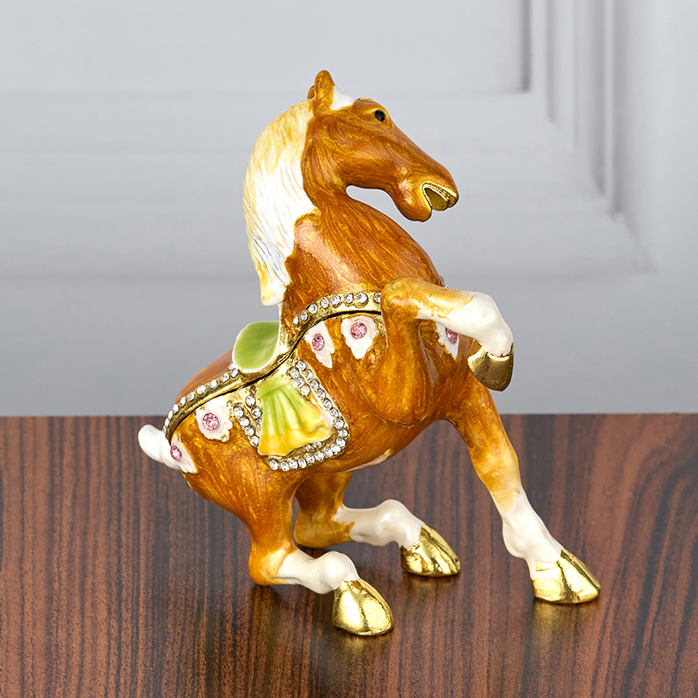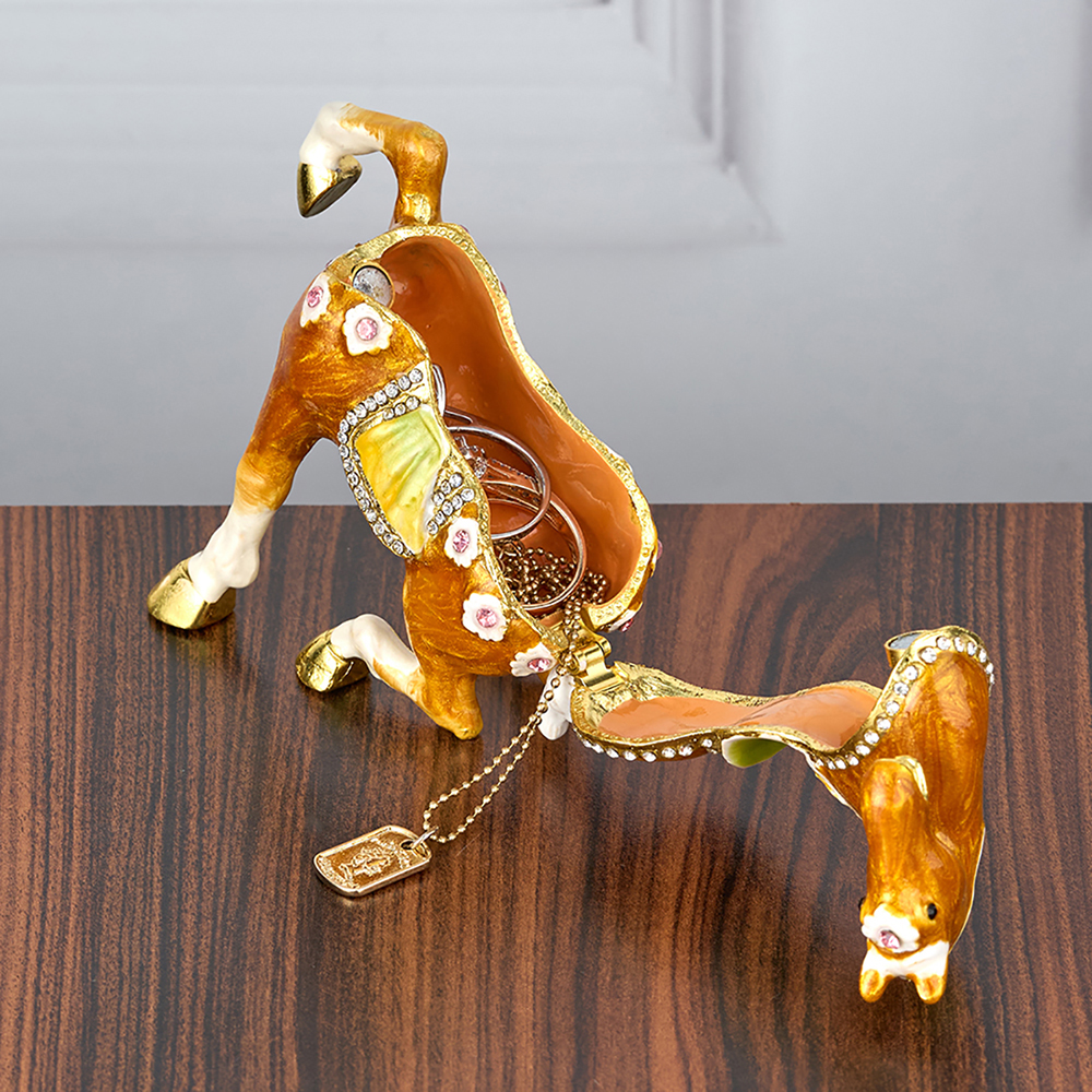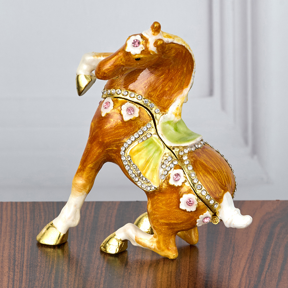 Шкатулка для украшений, фигурка, статуэтка Лошадь, в виде животных - это уникальное произведение ювелирного искусства, которое сочетает в себе изысканность формы и красоту животного мира. Каждая деталь фигурки Лошадь продумана до мельчайших нюансов, каждая выполнена с безупречным качеством и вниманием к деталям. Открывая шкатулку, можно увидеть внутреннюю часть, которая также оформлена с большой тщательностью. Внутри находится отделение, предназначенное для хранения ценностей или ювелирных изделий. Шкатулка в виде животных в стиле Фаберже является не только предметом роскоши и красоты, но и символом природы и ее величия. Она напоминает о богатстве и разнообразии животного мира. Такая шкатулка станет не только изысканным аксессуаром, но и настоящим произведением искусства, которое будет вызывать восхищение и восторг у вас и ваших близких. Шкатулка имеет надёжный магнитный замок. Каждое изделие упаковано в элегантную коробку с шелковым ложементом. Все статуэтки Лошадь выполнены и окрашены исключительно вручную с помощью уникального способа производства металлического литья сочетающего оригинальную технику эмали и филигранную инкрустацию австрийскими кристаллами. Помимо практической функции, шкатулка в виде фигурки послужит прекрасным украшением интерьера. Выбирайте и другие товары нашего ассортимента, нажав на значок Стиль-Ампир справа от фотографии товара.