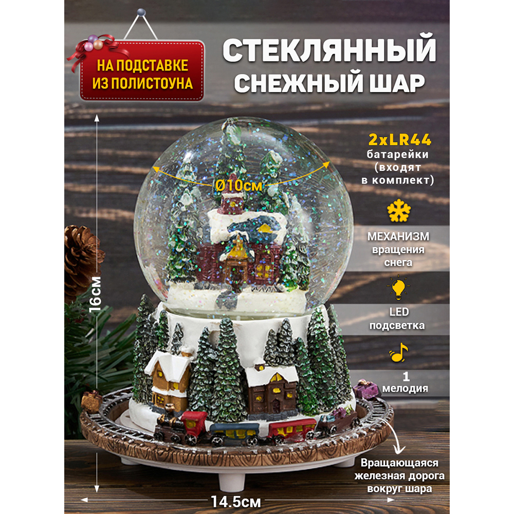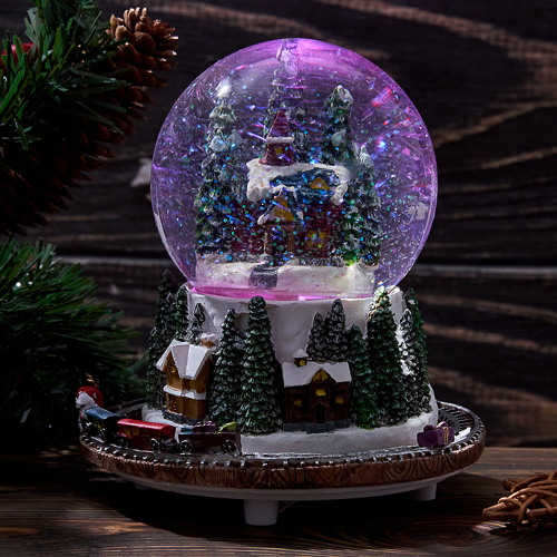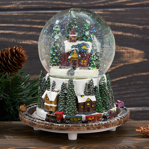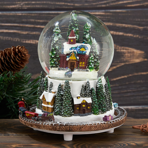 Музыкальный снежный шар - отличный подарок для детей и взрослых. Он дополнит сказочную атмосферу Нового года и поможет отвлечься от суеты. Шар имеет диаметр 10 см. Шар работает от двух элементов питания типа LR44 (в комплекте). При включении появляется сказочная подсветка и начинает вращаться подставка, создается эффект движения поезда. Музыка появляется после механического завода тумблера, расположенного на дне подставки шарика. А волшебная метель создаст ощущение праздника в вашем доме. Уважаемые клиенты при заказе снежных шаров, обращайте внимание на температуру воздуха в регионе отправки и в регионе получения. При температуре воздуха ниже -10 градусов шар может быть поврежден. Выбирайте и другие товары нашего ассортимента, нажав на значок Стиль-Ампир справа от фотографии товара.