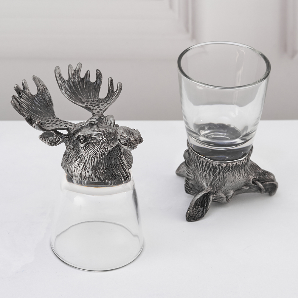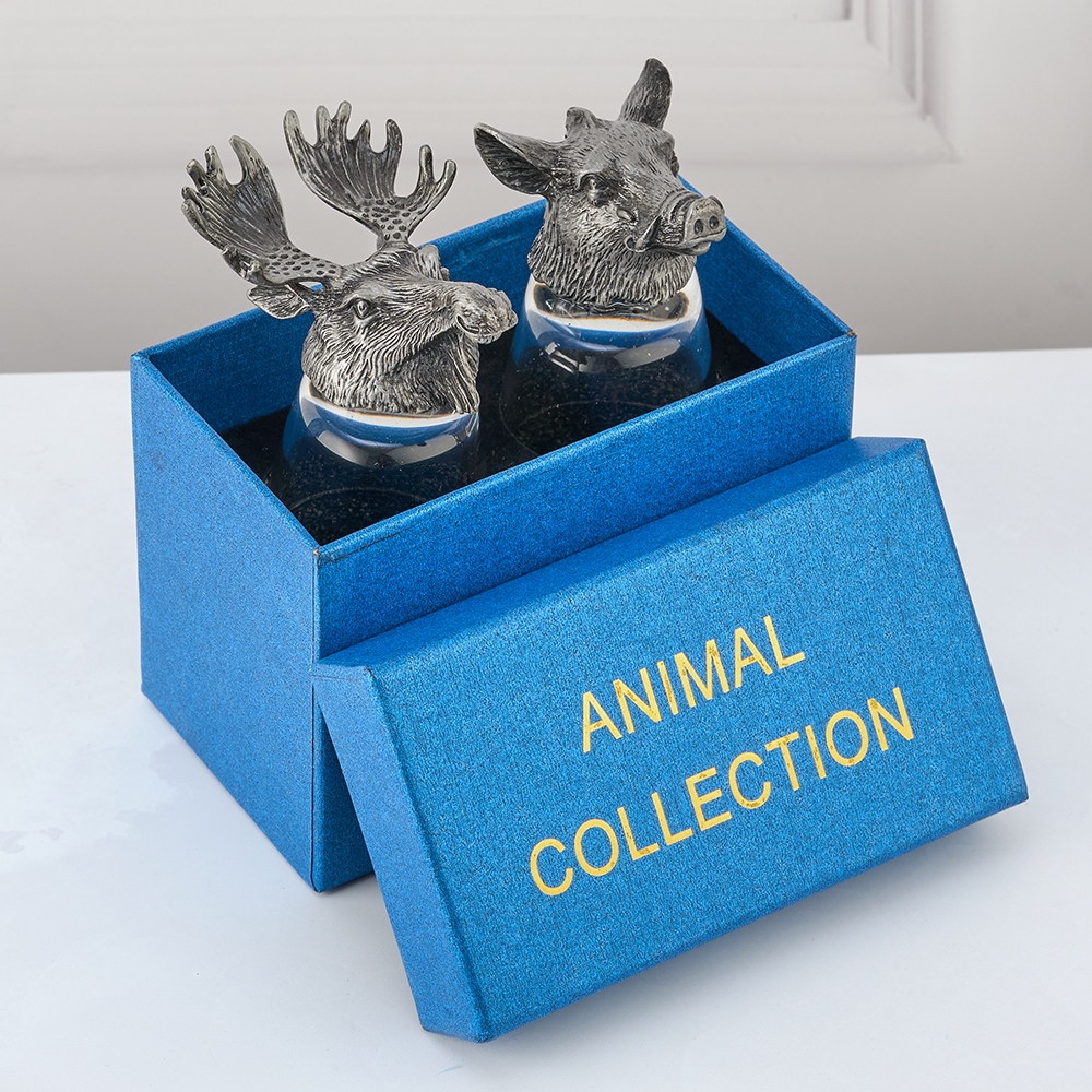 Набор стопок перевертышей это оригинальный подарок на любой праздник или день рождения. Отличительной особенностью стопок являются головы животных. Эксклюзивный подарочный набор стопок перевертышей выполнен в технике художественного литья под вакуумом. Головы животных изготовлены из сплава олова. Стеклянные стопки выполнены из огнеупорного стекла. Смотрятся очень естественно благодаря тонкой работе производителя. При этом они обеспечивают стопке устойчивость когда она наполняется жидкостью. Благодаря оригинальному оформлению, стопки достойно выполнят роль эксклюзивного сувенира их по достоинству оценят коллеги по работе, родственники и друзья. Советы по уходу и эксплуатации: Не использовать средства,содержащие хлор и аммиак. Не использовать абразивные моющие средства.