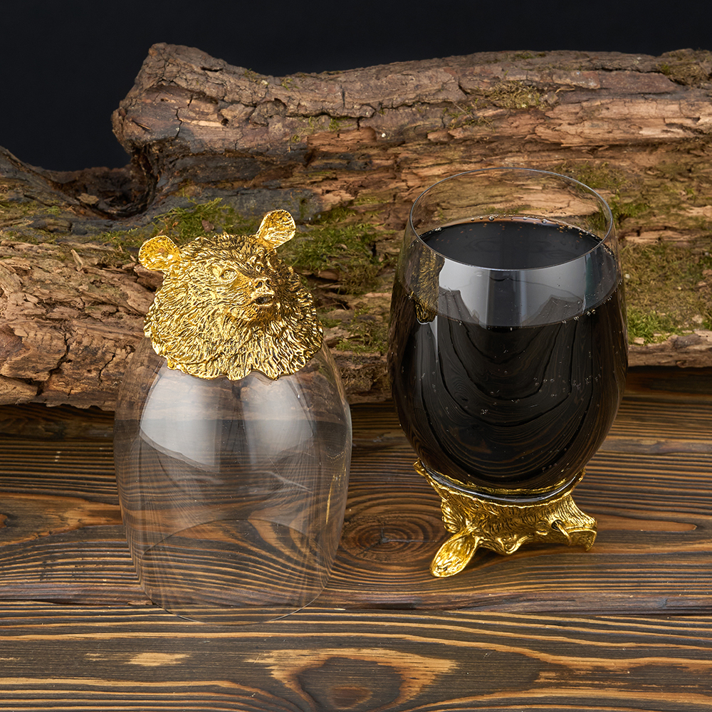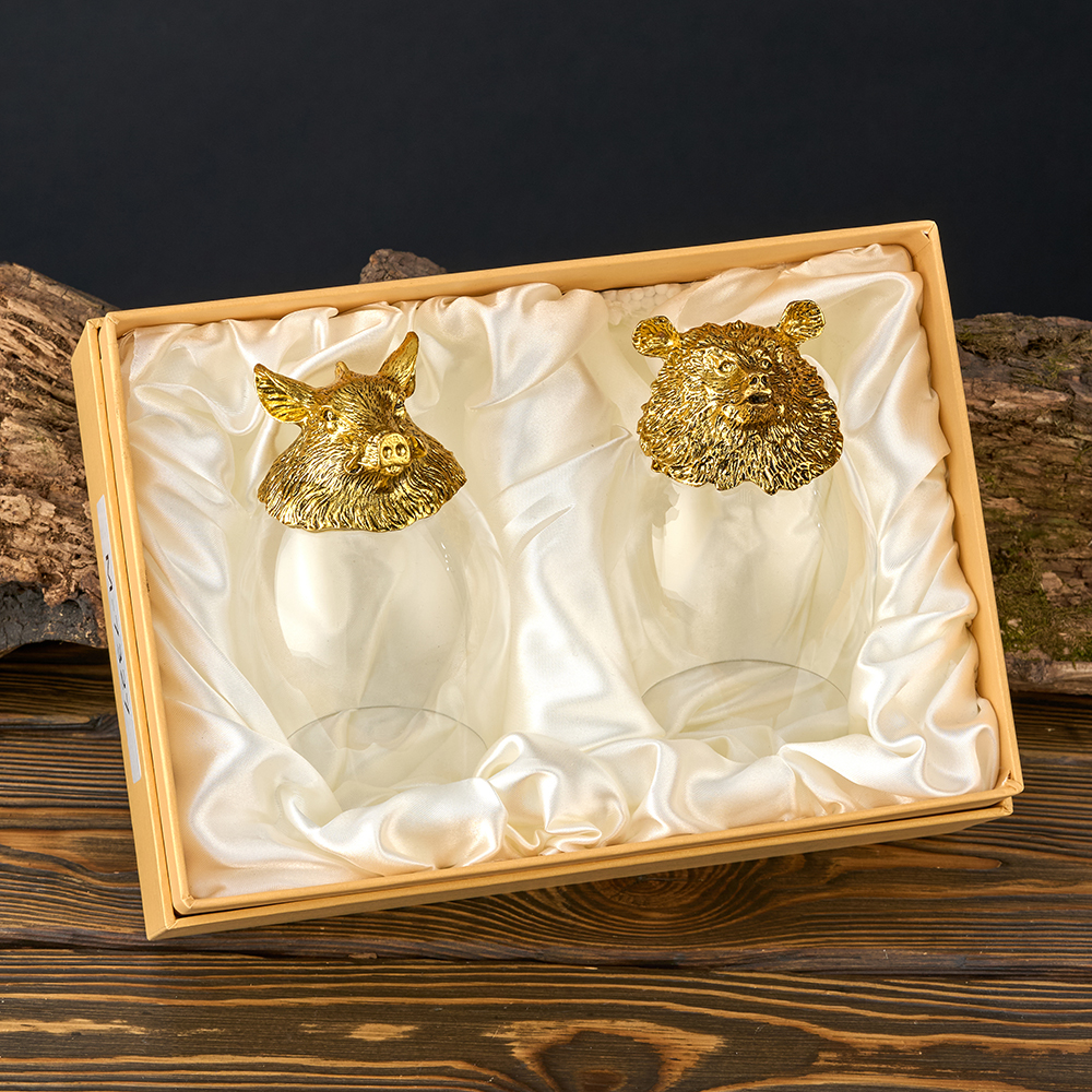 Бокалы для виски Охотник: Медведь и Кабан" оригинальный подарок практически к любому празднику. Бокалы для коньяка подарочные с головами животных перевертыши будут красиво смотреться на вашем праздничном столе. Подставка бокала имеет оригинальную стилизованную форму в виде головы Кабана и Медведя, покрытие металла 24K Gold Color Plated. размер бокала для виски 7,5х7,5х13 см. Объем бокала 350 мл, вес одного бокала 195 гр. У бокала эффектная форма, оригинальная форма подставки ножки в виде животных, которую очень удобно держать в руке. Универсальные бокалы перевертыши идеально подойдут для виски, шампанского и вина, прохладной воды, коктейлей и лимонада. Они легко станут новинкой, практичной альтернативой традиционной посуде на вашей кухне используя, как для алкогольных и безалкогольных напитков будь то виски или вино, пиво или просто сок. При изготовлении использовано уникальное стекло, оно не теряет свой товарный вид при ежедневном применении, устойчиво к воздействию чистящих средств и в тоже время абсолютно безопасно. Бокалы винные имеющий модный дизайн и подходят для сервировки стола дома, на кухне, а также для бара. Идеальный презент учителю или воспитателю, можно подарить брату, другу или коллеге. Вы можете подарить любимому мужчине или мальчику, начальнику или шефу, возможно мужу или молодому человеку, отцу. Декоративные бокалы станут прекрасным подарком на Новый год или День рождения, Новоселье или Юбилей. Бокалы нельзя мыть в посудомоечной машине. Отличительной особенностью бокалов перевертышей являются головы животных. Эксклюзивный подарочный набор стопок перевертышей выполнен в технике художественного литья под вакуумом. Головы животных изготовлены из сплава олова и металла. Стеклянные бокалы выполнены из огнеупорного стекла. При этом они обеспечивают бокалу устойчивость когда он наполняется жидкостью. Они упакованы в желтый подарочный кофр с атласным ложементом. Выбирайте и другие товары нашего ассортимента, нажав на значок Стиль-Ампир справа от фотографии товара.