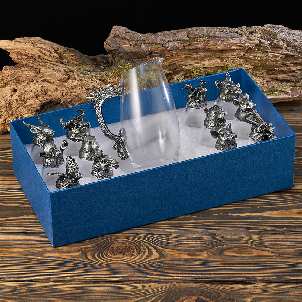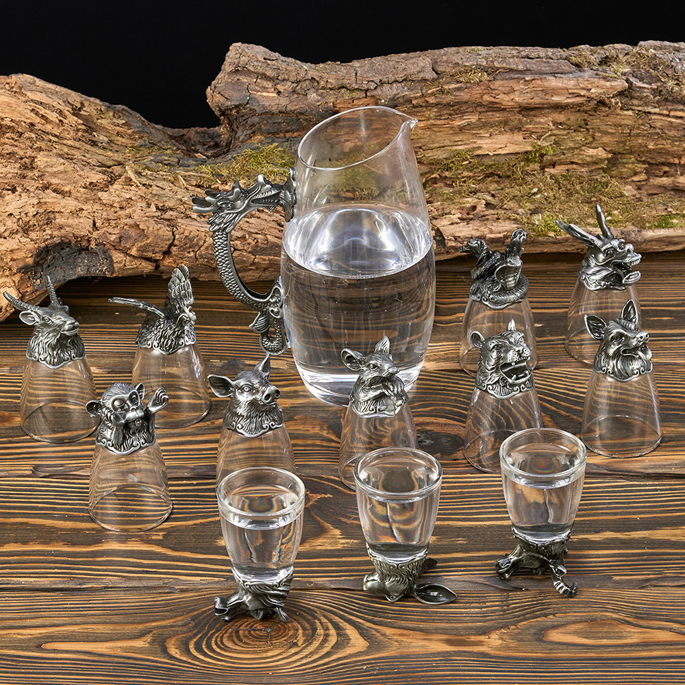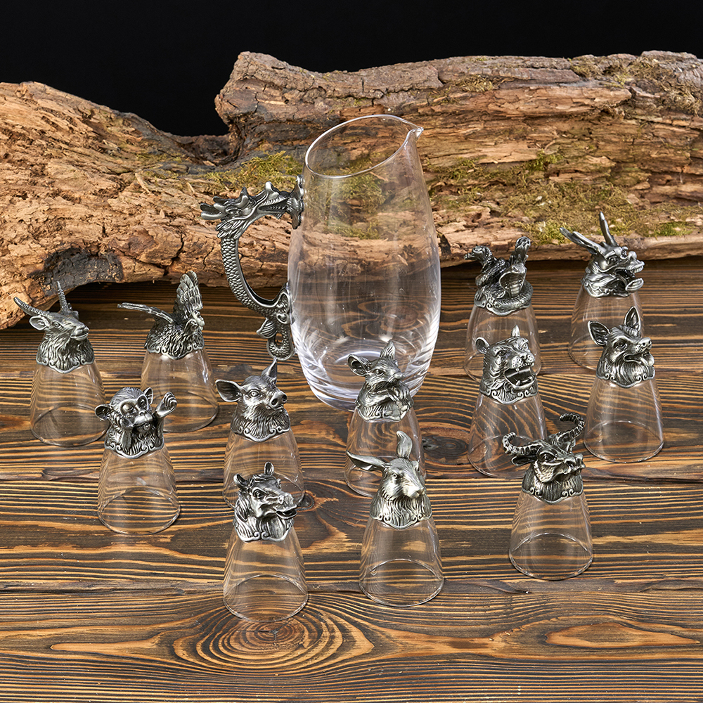 Набор стопок для водки с кувшином, набор из 12-ти стопок для водки перевертышей и кувшина в виде Дракона оригинальный подарок на любой праздник или день рождения. В комплекте стопок с головами животных идет подарочная упаковка из плотного прессованного картона с мягким ложементом. Объем стопки 35 мл ,вес 67 грамм, объем кувшина 500 мл. Размер стопки d 4,2 см, h 7,8 см, размер кувшина 12х7,5х15,5 см с ручкой, размер колбы кувшина 7,5х7,5х15,5 см. Отличительной особенностью стопок перевертышей являются головы животных. Эксклюзивный подарочный набор стопок перевертышей с кувшином выполнен в технике художественного литья под вакуумом. Головы животных изготовлены из сплава олова и металла с покрытием 18K Silver Plated. Стеклянные стопки выполнены из огнеупорного стекла. Смотрятся очень естественно благодаря тонкой работе производителя, ручка кувшина выполнена в виде Дракона, который является символом 2024 года. Головы животных обеспечивают стопке устойчивость когда она наполняется жидкостью. Благодаря необычному оформлению, стопки достойно выполнят роль эксклюзивного сувенира, их по достоинству оценят коллеги по работе, родственники и друзья. Набор рюмок перевертышей с кувшином может стать подарком мужу, отцу, начальнику, руководителю, коллеге и дедушке. Это оригинальный подарок на юбилей, свадьбу, годовщину, новоселье и на др, который выглядит дорогим и красивым. Советы по уходу и эксплуатации: не использовать средства, содержащие хлор и аммиак. Не использовать абразивные моющие средства. Выбирайте и другие товары нашего ассортимента, нажав на значок Стиль-Ампир справа от фотографии товара.