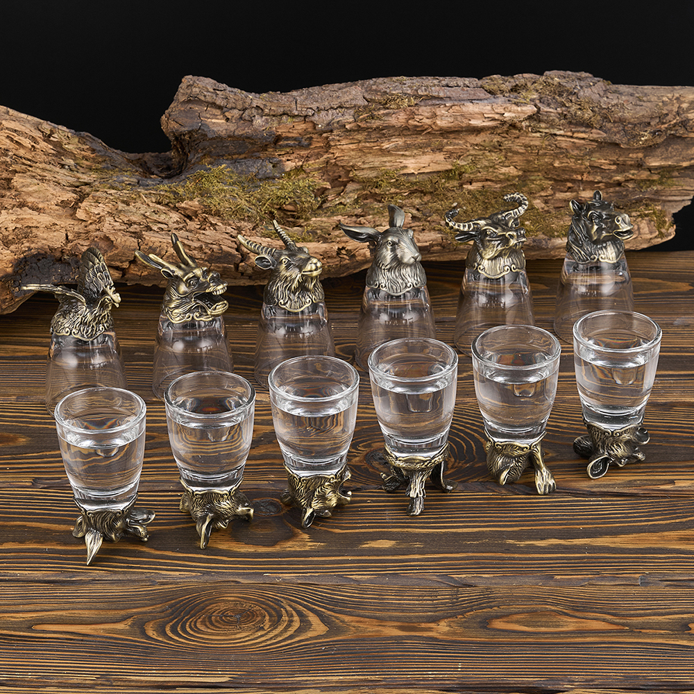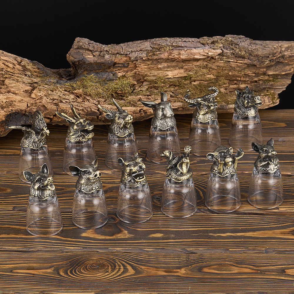 Стопки для водки, набор из 12-ти стопок для водки перевертышей Символы года оригинальный подарок на любой праздник или день рождения. Объем стопки 50 мл ,вес 185 грамм. Размер стопки d 4,8 см, h 9 см. Отличительной особенностью стопок перевертышей являются головы животных обозначающие Символы года. Эксклюзивный подарочный набор стопок перевертышей выполнен в технике художественного литья под вакуумом. Головы животных изготовлены из сплава олова и металла, стопки выполнены из огнеупорного стекла. Смотрятся очень естественно благодаря тонкой работе производителя. При этом они обеспечивают стопке устойчивость когда она наполняется жидкостью. Благодаря необычному оформлению, стопки достойно выполнят роль эксклюзивного сувенира, их по достоинству оценят коллеги по работе, родственники и друзья. Набор рюмок перевертышей может стать подарком мужу, отцу, начальнику, руководителю, коллеге и дедушке. Это оригинальный подарок на юбилей, свадьбу, годовщину, новоселье и на др, который выглядит дорогим и красивым. Советы по уходу и эксплуатации: не использовать средства, содержащие хлор и аммиак. Не использовать абразивные моющие средства. Выбирайте и другие товары нашего ассортимента, нажав на значок Стиль-Ампир справа от фотографии товара.