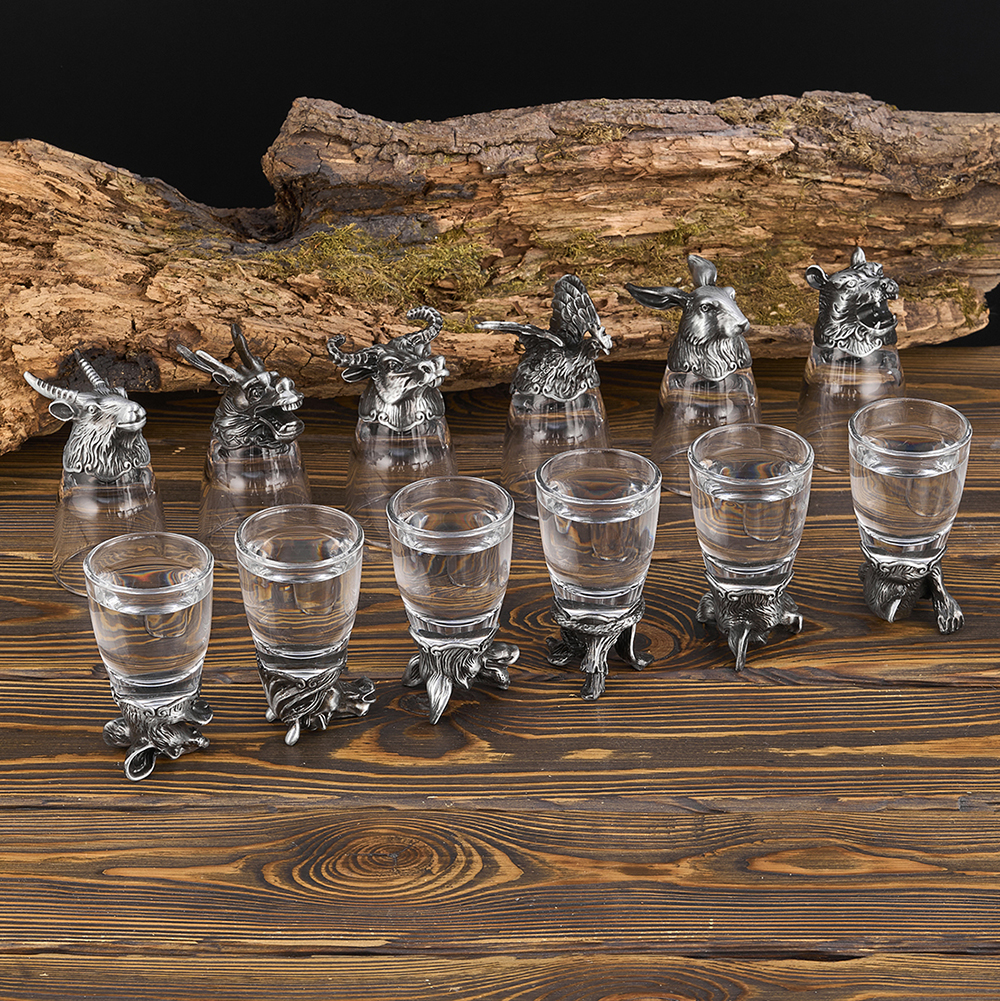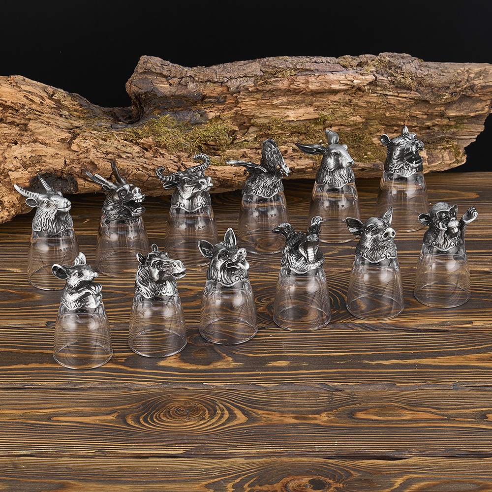Стопки для водки, набор из 12-ти стопок для водки перевертышей Символы года оригинальный подарок на любой праздник или день рождения. Объем стопки 50 мл ,вес 185 грамм. Размер стопки d 4,8 см, h 9 см. Отличительной особенностью стопок перевертышей являются головы животных обозначающие Символы года. Эксклюзивный подарочный набор стопок перевертышей выполнен в технике художественного литья под вакуумом. Головы животных изготовлены из сплава олова и металла, стопки выполнены из огнеупорного стекла. Смотрятся очень естественно благодаря тонкой работе производителя. При этом они обеспечивают стопке устойчивость когда она наполняется жидкостью. Благодаря необычному оформлению, стопки достойно выполнят роль эксклюзивного сувенира, их по достоинству оценят коллеги по работе, родственники и друзья. Набор рюмок перевертышей может стать подарком мужу, отцу, начальнику, руководителю, коллеге и дедушке. Это оригинальный подарок на юбилей, свадьбу, годовщину, новоселье и на др, который выглядит дорогим и красивым. Советы по уходу и эксплуатации: не использовать средства, содержащие хлор и аммиак. Не использовать абразивные моющие средства. Выбирайте и другие товары нашего ассортимента, нажав на значок Стиль-Ампир справа от фотографии товара.