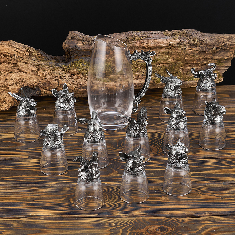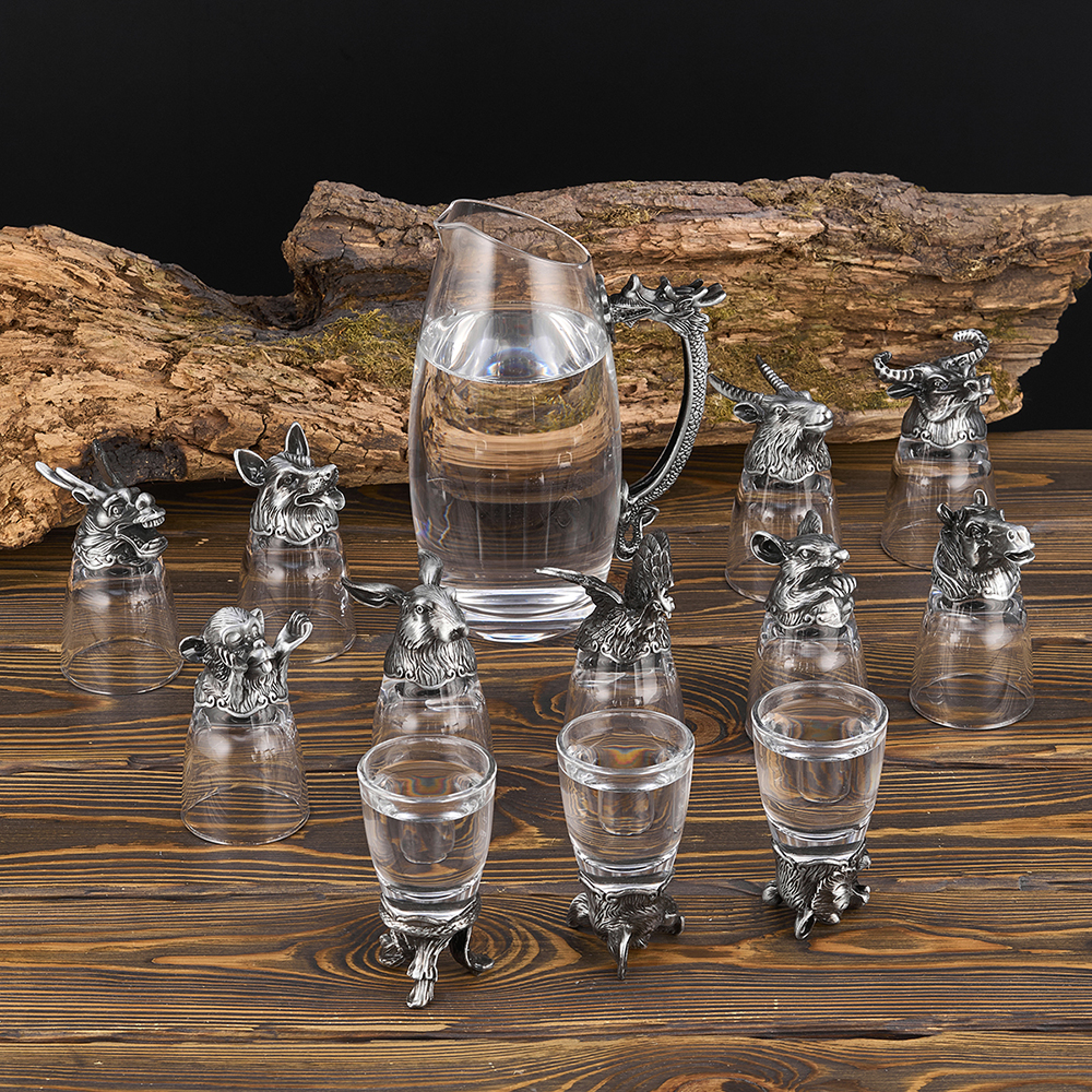 Набор стопок для водки с кувшином, набор из 12-ти стопок для водки перевертышей и кувшина в виде Дракона оригинальный подарок на любой праздник или день рождения. Объем стопки 50 мл ,вес 185 грамм, объем кувшина 500 мл. Размер стопки d 4,8 см, h 9 см, размер кувшина 11,5х8,5х17 см с ручкой. Отличительной особенностью стопок перевертышей являются головы животных. Эксклюзивный подарочный набор стопок перевертышей с кувшином выполнен в технике художественного литья под вакуумом. Головы животных изготовлены из сплава олова и металла. Стеклянные стопки выполнены из огнеупорного стекла. Смотрятся очень естественно благодаря тонкой работе производителя, ручка кувшина выполнена в виде Дракона. Головы животных обеспечивают стопке устойчивость когда она наполняется жидкостью. Благодаря необычному оформлению, стопки достойно выполнят роль эксклюзивного сувенира, их по достоинству оценят коллеги по работе, родственники и друзья Набор рюмок перевертышей с кувшином может стать подарком мужу, отцу, начальнику, руководителю, коллеге и дедушке. Это оригинальный подарок на юбилей, свадьбу, годовщину, новоселье и на др, который выглядит дорогим и красивым. Советы по уходу и эксплуатации: не использовать средства, содержащие хлор и аммиак. Не использовать абразивные моющие средства. Выбирайте и другие товары нашего ассортимента, нажав на значок Стиль-Ампир справа от фотографии товара.