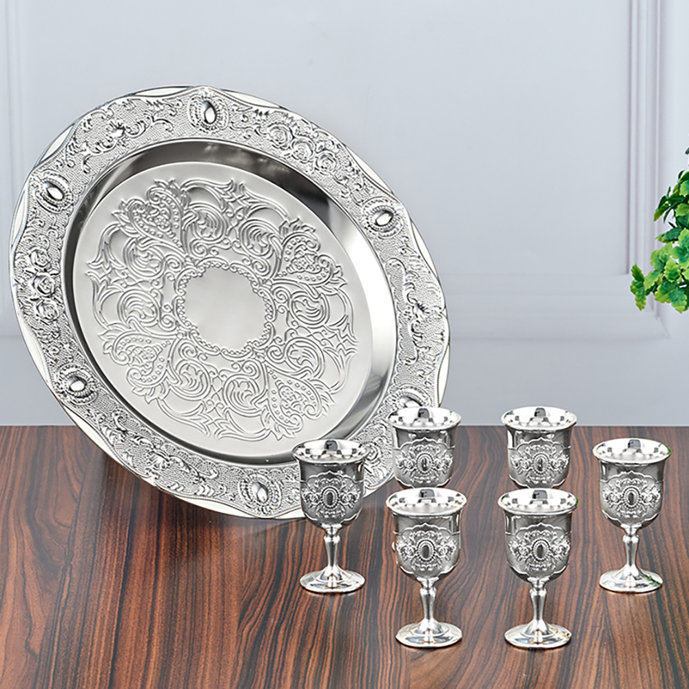 Рюмки для водки необычные, с оригинальным дизайном, набор из 6 рюмок с подносом из нержавеющей стали с покрытием 18K Silver Plated полезный аксессуар для сервировки стола. Декоративный набор из 6 рюмок с резным узором "Гроздь Винограда" посуда - идеально подходит для вашего интерьера, для дома, дачи, квартиры, для кухни или ресторана, для сервировки стола на каждый день, украсит праздничный или обеденный стол. Рюмки применяются для употребления водки, ликера, коктейлей, текилы и любых крепких алкогольных напитков, имеют объем 35 мл, высоту 7,5 см и диаметр 4,5 см., вес одной рюмки 58 гр. Рюмки металлические - не впитывают запах, легко моются, после мытья вытирать мягкой тканью насухо (не мыть в посудомоечной машине). Рюмки на подносе будут отлично выглядеть как декор праздничного интерьера и прекрасно дополнят уютную сервировку стола. Подарочный набор из 6 рюмок на подносе - лучший подарок парню, другу, дедушке, брату, папе, любимому, мужу, мужчине, для нее, для мамы, бабушки, девушки, любимой жены, для коллеги по работе, начальнику, учителю, врачу, подруге, друзьям на новый год, на рождество, на 8 марта, на 14 февраля, на день рождения, на именины, на любой повод или без повода просто так. В комплект набора входит поднос из аналогичного материала, диаметр подноса 25 см и высота 1,5 см., вес 196 гр. Поднос можно применять как отдельный предмет сервировки стола. Выбирайте и другие товары нашего ассортимента, нажав на значок Стиль-Ампир справа от фотографии товара.